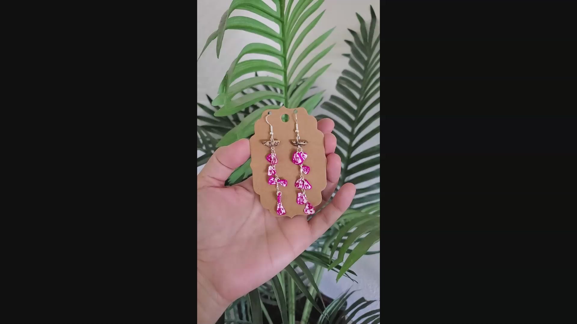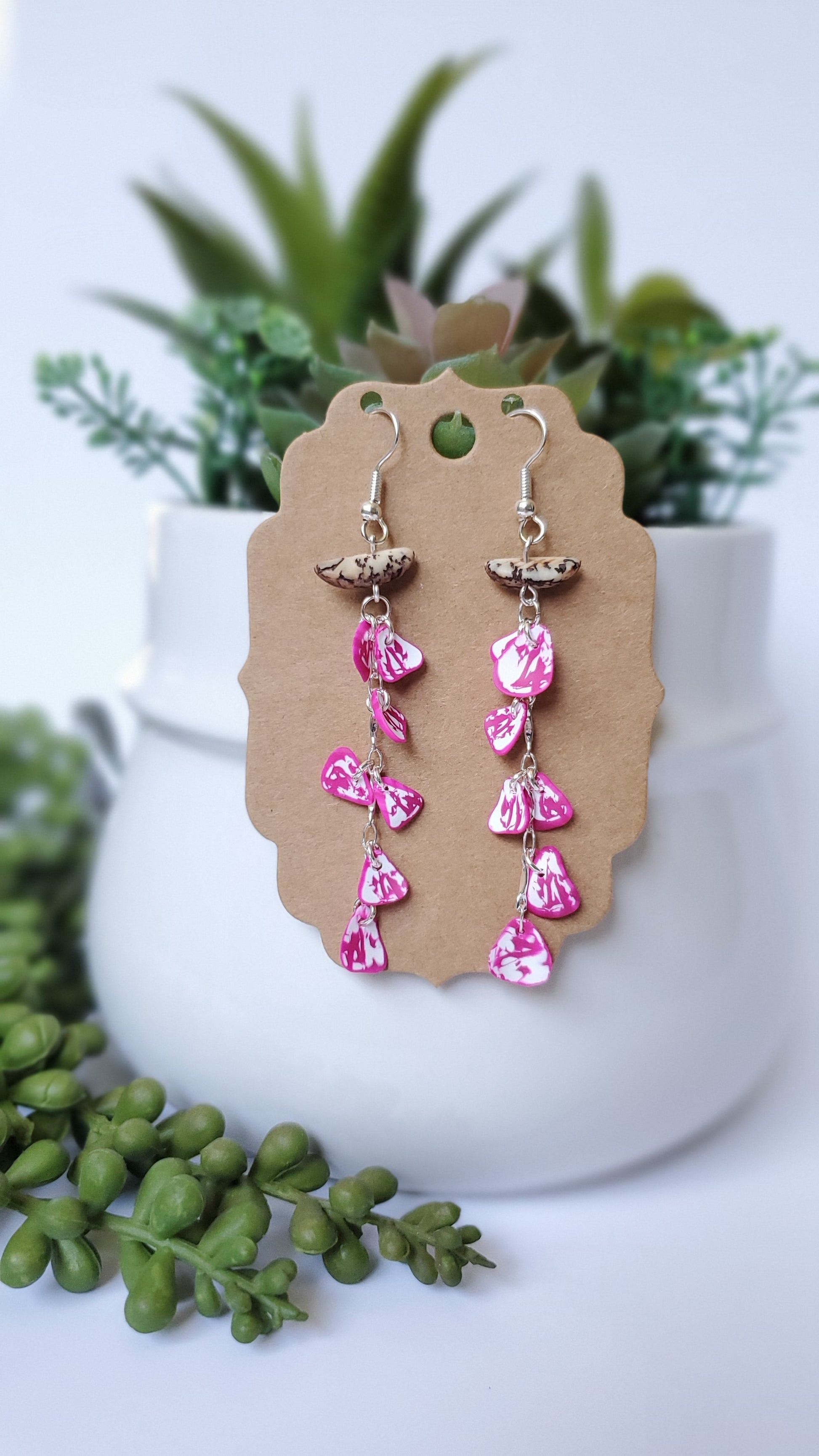 These handcrafted polymer clay earrings feature cascading pink and white marbled petals with a touch of natural charm from the beige speckled top bead. Each petal is individually shaped, creating gentle movement and a fluid, organic design that feels as light as it looks.