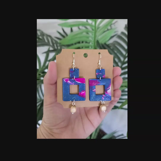 These handcrafted polymer clay earrings feature a bold mix of deep blue and vibrant magenta with soft white marbling.